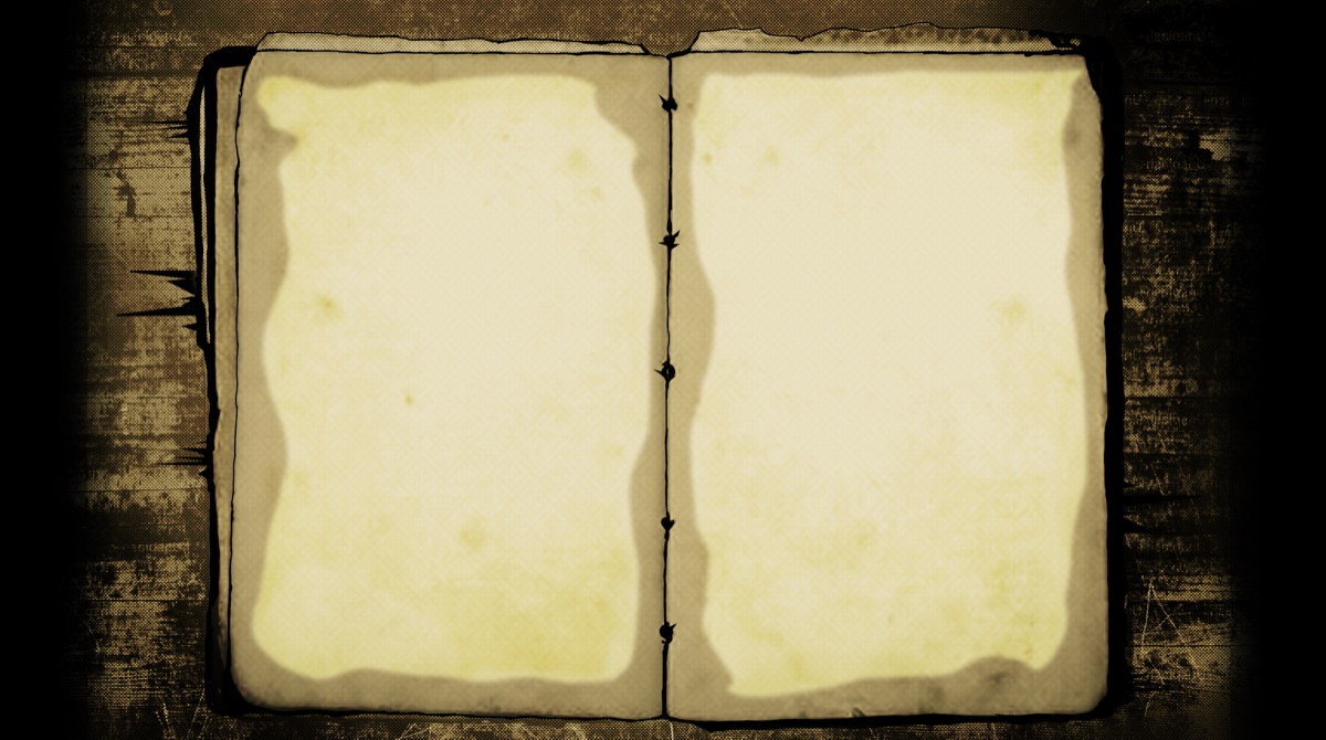 Ecran de navigation — Livre ouvert double-page, reliure apparente, texture bois en arriere-plan. Ce template sera rempli dynamiquement avec les informations collectees en jeu.