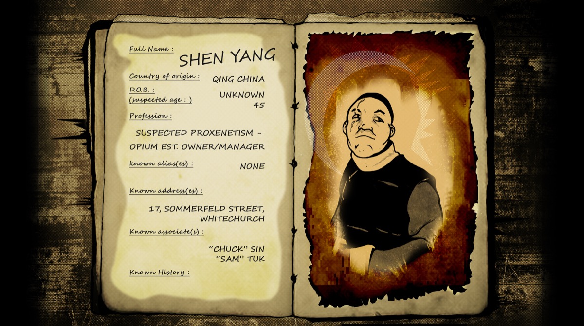 | 1 | Homme corpulent, tablier/robe noire, bras croises, expression severe | Shen Yang — Proprietaire/gerant d'opium | Correspond a la fiche : 45 ans, Qing China, proxenetisme/opium. Adresse 17 Sommerfeld Street. |