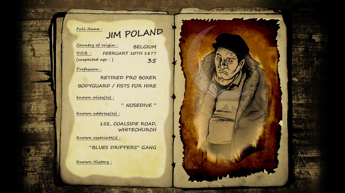 | 3 | Homme trapu, casquette, kimono/tenue de travail, air patibulaire (+portrait gros plan) | Jim Poland — Ancien boxeur / garde du corps | Correspond a la fiche : Belgique, 35 ans, alias "Nosedive", "Blues Drippers" gang. Meurt scene 3. |