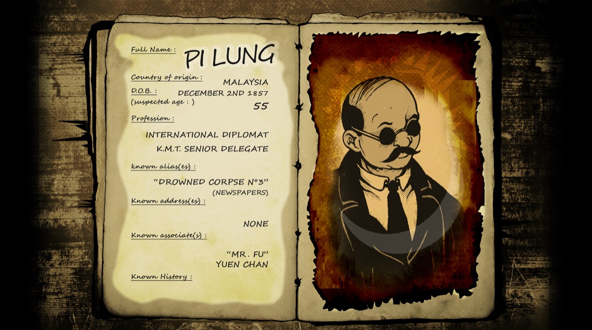 | 3 | Homme corpulent, manteau noir long, monocle, moustache, crane partiellement chauve | Pi Lung — Diplomate international | Correspond a la fiche : 55 ans, K.M.T. Senior Delegate. Alias "Drowned Corpse No.3" |