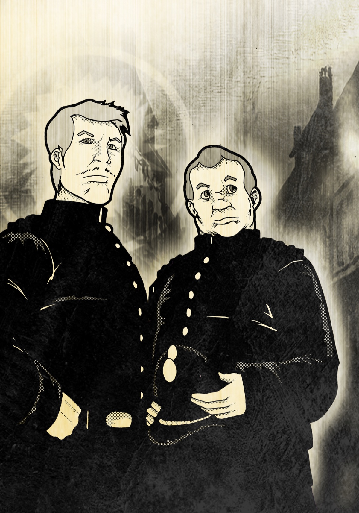 Variante 2 — Portrait de face, silhouettes de batiments gothiques en arriere-plan. Cadrage plus dramatique.