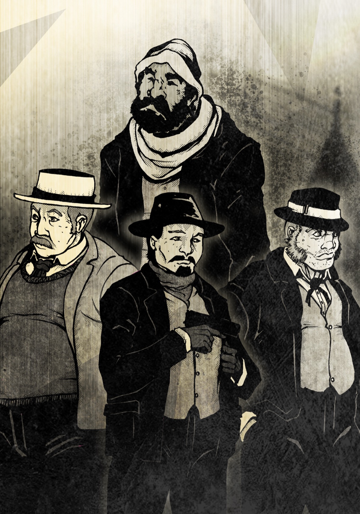 Membres visibles : Figure massive emmittouflee en arriere-plan (capuche, echarpe — le "mastermind" ?), 3 hommes en chapeaux au premier plan : un avec panama et moustache, un barbu avec fedora, un trapu avec canotier.