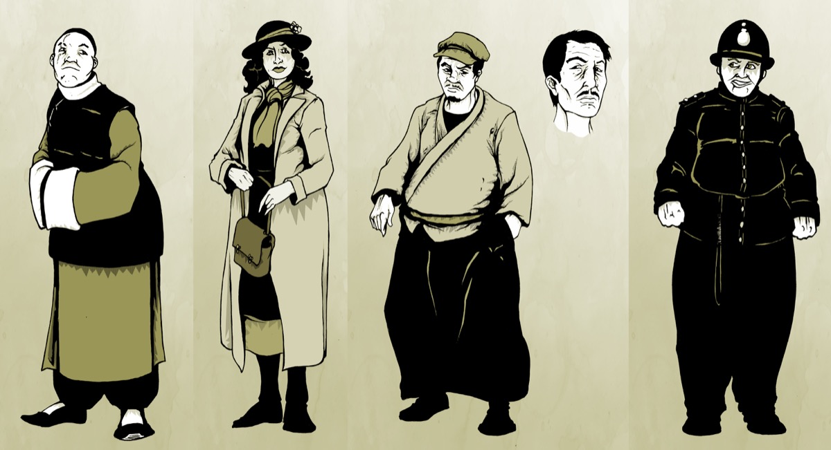 | Inspector Kerry | Homme costaud, moustache, gilet beige, noeud papillon, bras de chemise | Detective Sergeant de Scotland Yard, 36 ans. Experimenté, marie, autorite naturelle. Style "bruiser intelligent". |