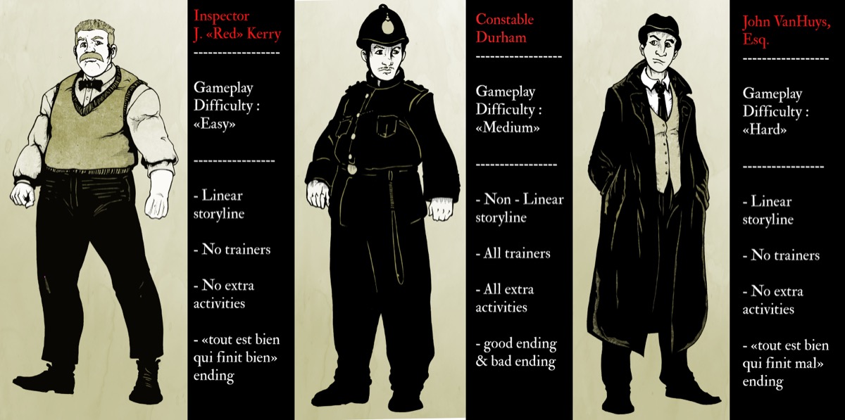 De gauche a droite : Inspector J. "Red" Kerry (Easy), Constable Durham (Medium), John VanHuys, Esq. (Hard). Chaque personnage est accompagne de sa fiche gameplay.