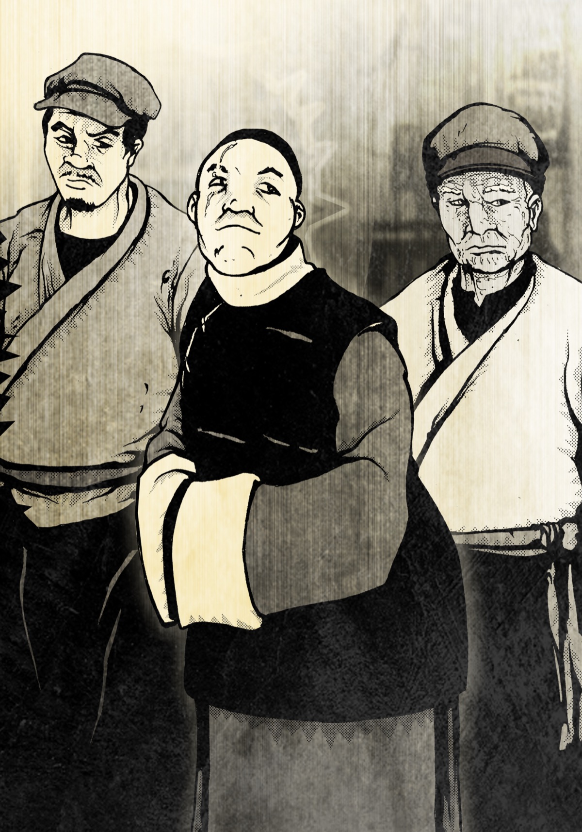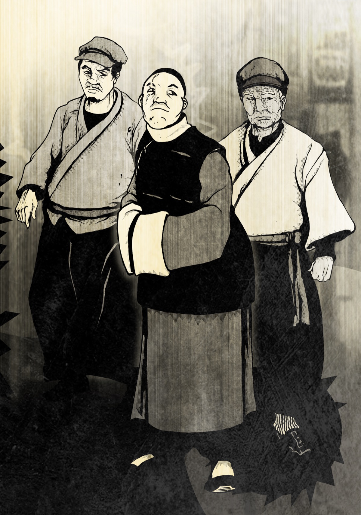 Membres visibles : Un homme en manteau et casquette (muscle, agressif), un homme corpulent bras croises (chef local ?), un vieil homme en tunique (sage/ancien).
